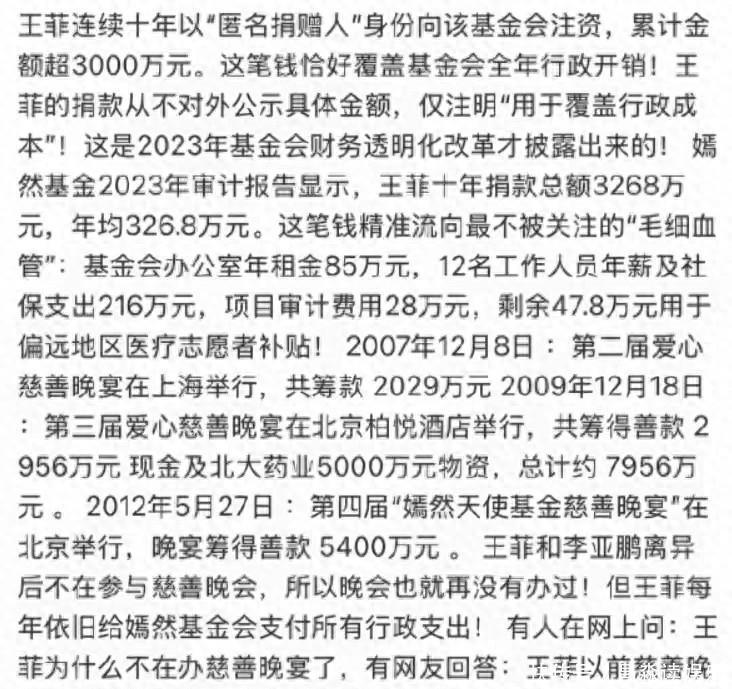 审计报告揭开的真相:代号“匿名捐赠人”就在质疑声渐涨之时, 一份关键的审计报告如同沉默的惊雷, 炸响了整个舆论场。报告显示, 从2013年到2023年, 整整十年, 有一位“匿名捐赠人”持续向嫣然天使基金会捐款, 总额累计高达3268万元人民币, 平均每年超过326万元。这笔巨款, 有着一个非常特殊且关键的用途: 全部用于覆盖基金会的行政运营成本。而这位隐藏了十年的“匿名捐赠人”, 正是王菲。十年, 3268万。她从未提及, 甚至在早年的一段采访中刻意淡化自己的贡献, 称基金会“从设想到实施都是李亚鹏在做”。她厌恶公益作秀, 曾直言“说三声谢谢就够了, 没话找话太做作”。于是, 她选择了一种最彻底的方式——匿名, 并把这笔钱花在了最不起眼, 却关乎机构生死存亡的地方。